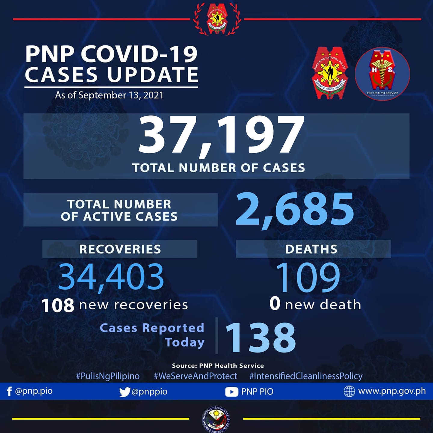 According to latest Philippine National Police data, the additional 138 cases pushed the total COVID-19 cases in the police force to 37197.