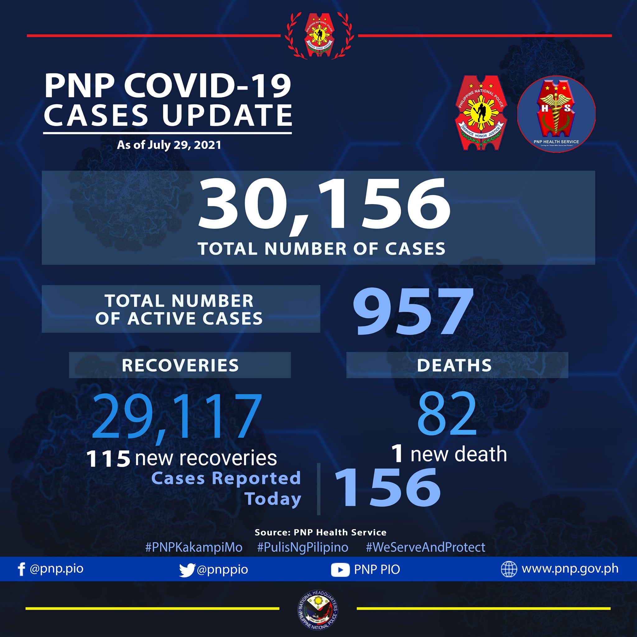 According to the Philippine National, the additional 156 cases pushed the PNP COVID-19 total to 30156.
