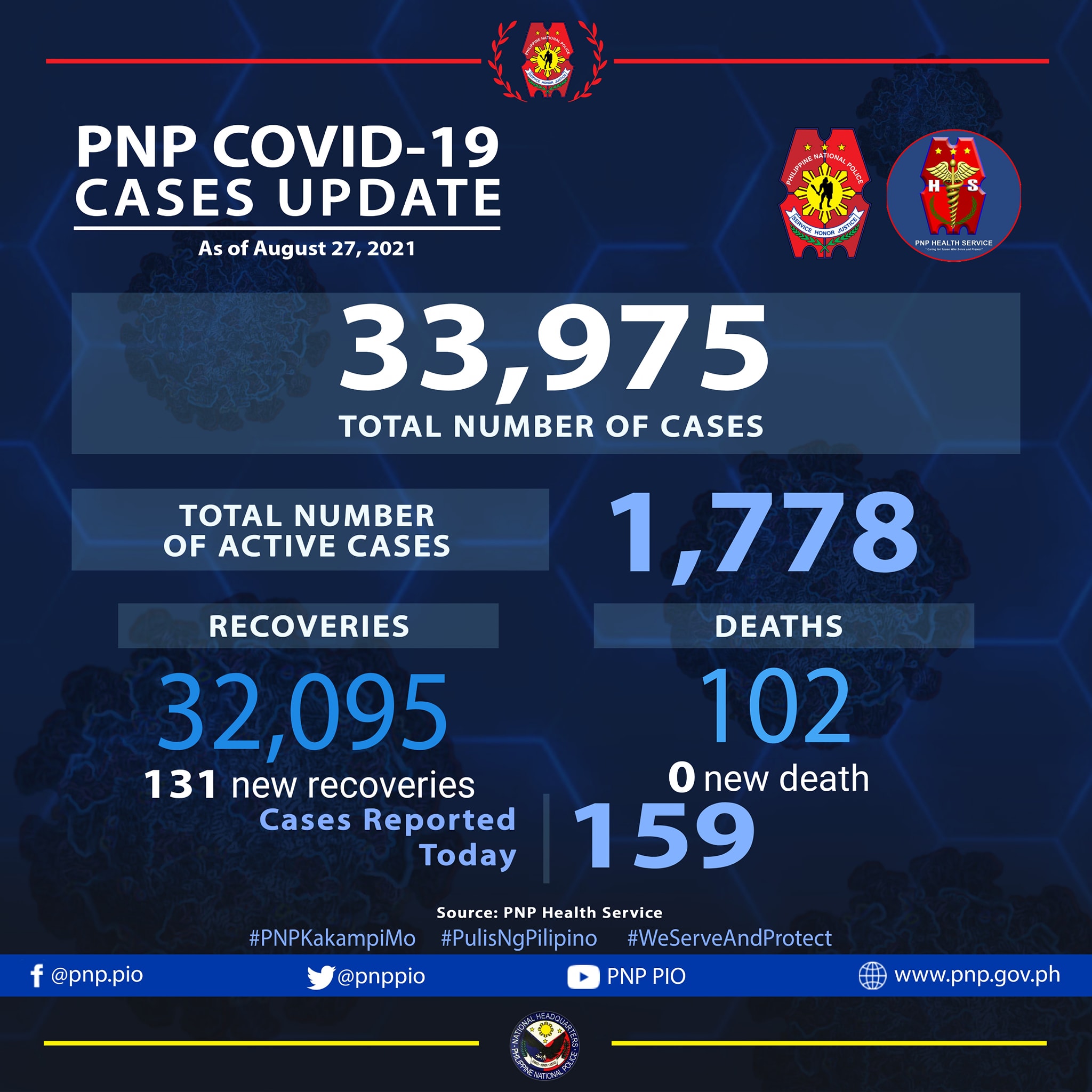 According to the PNP, the additional 159 COVID-19 cases pushed the total PNP COVID-19 tally to 33975.