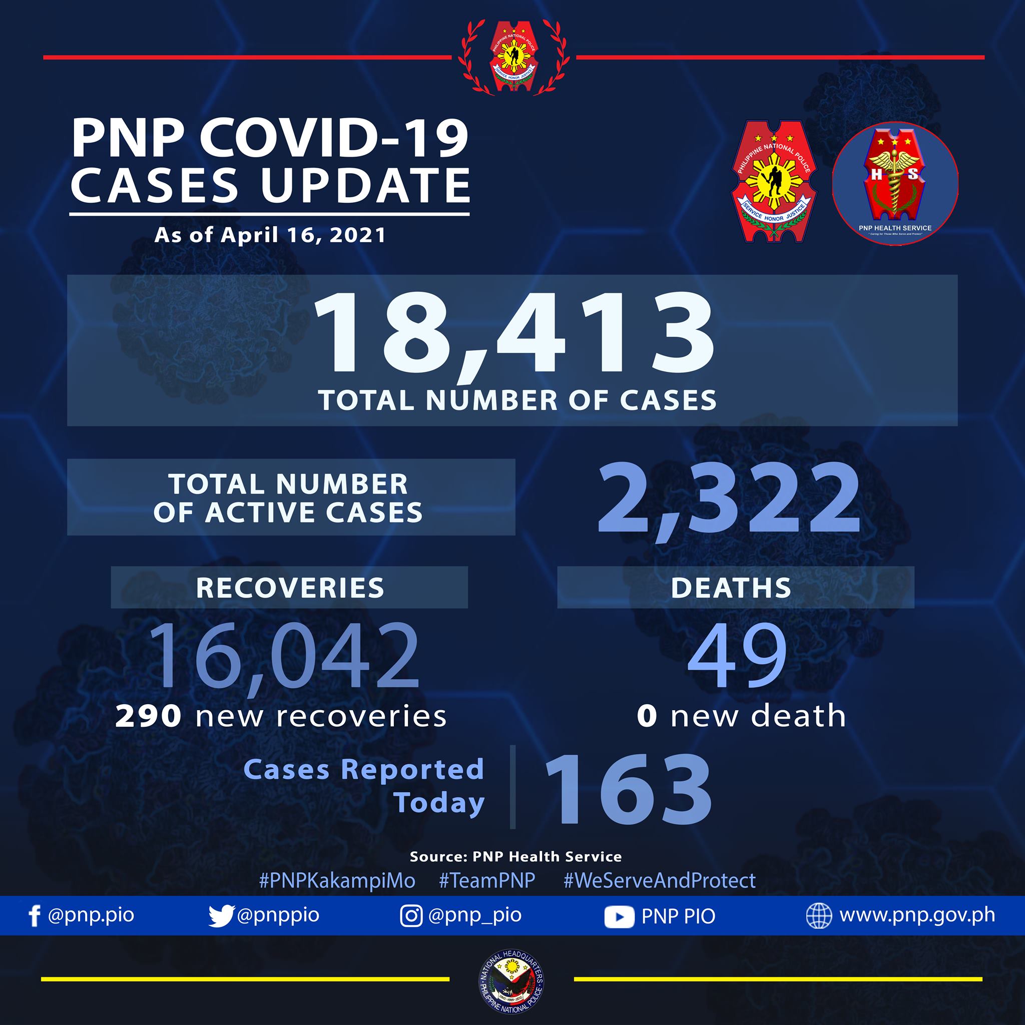 The Philippine National Police said the additional 163 cases pushed the PNP COVID-19 total to 18413.