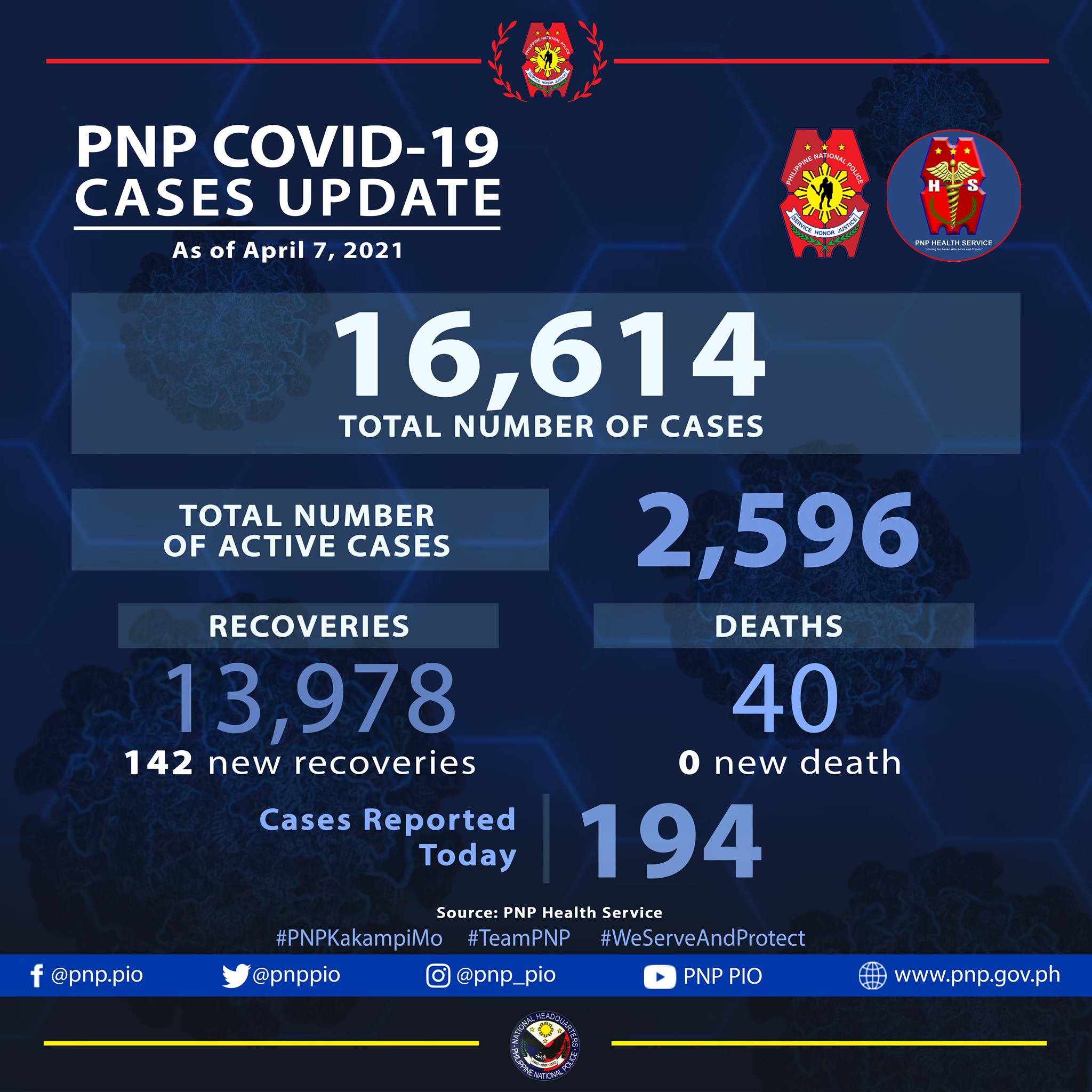 According to PNP data released on Thursday, April 8, the additional 194 cases pushed the PNP COVID-19 total to 16614.