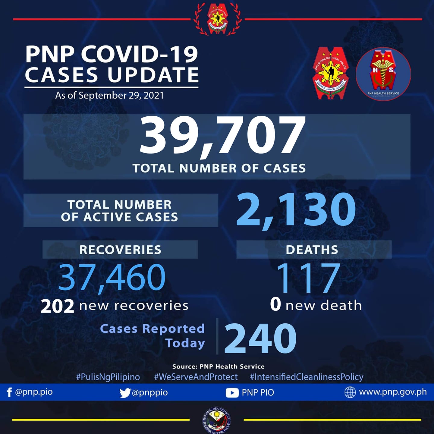 According to Philippine National Police data, the additional 240 cases pushed the total PNP COVID-19 cases to 39,707.
