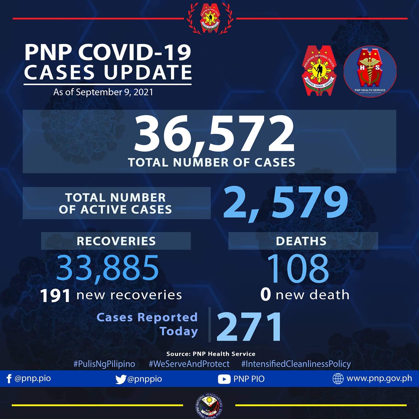 According to the Philippine National Police, the additional 271 cases pushed the total COVID-19 cases among members of the police force to 36572.