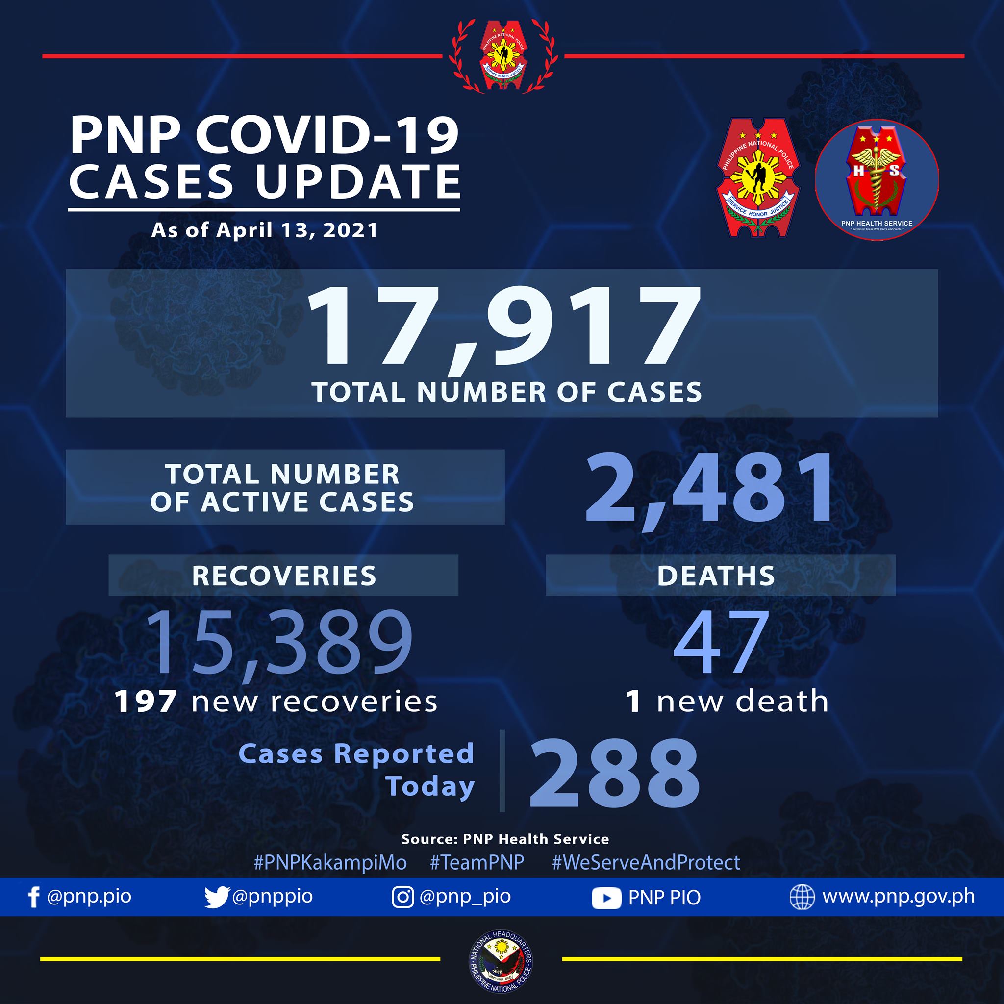 Data released by the Philippine National Police on Wednesday, April 14, showed the additional 288 cases pushed the PNP COVID-19 total to 17917.