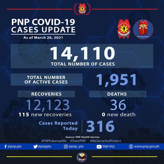 According to PNP data released on Saturday, March 27, the additional 316 cases pushed the PNP COVID-19 total to 14,110.