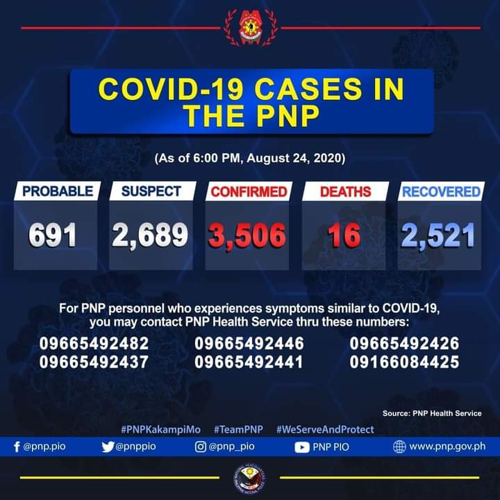 The PNP said according to data as of Monday, the number of COVID-19 cases in its organization rose as well, from 3380 on Sunday, to 3506.