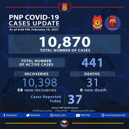 Thirty-seven more COVID-19 cases among PNP personnel pushed the PNP COVID-19 total to 10870.