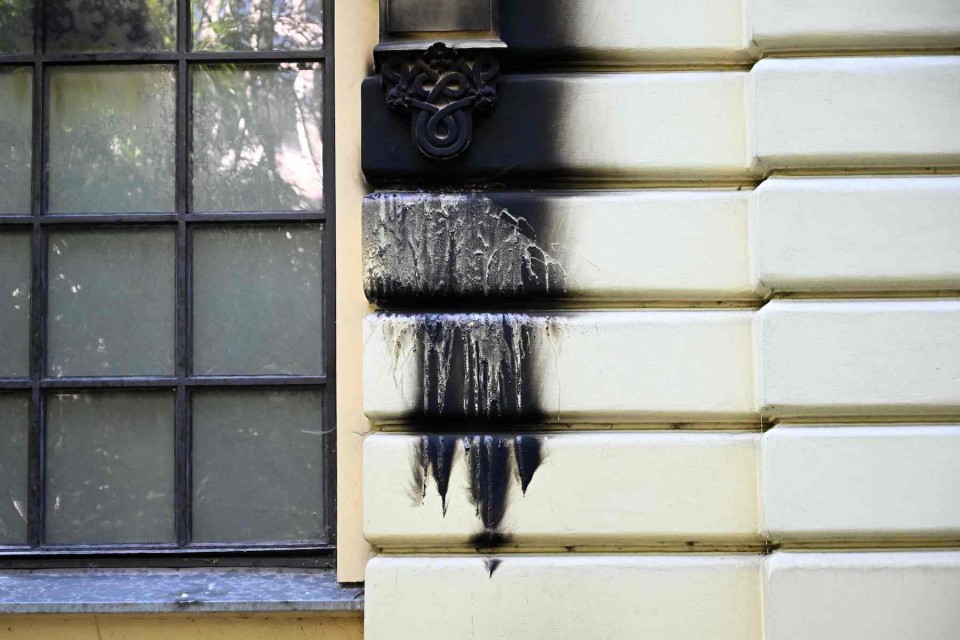 Traces of flames are seen on the facade of the Nozyk Synagogue in Warsaw on May 1, 2024, after a Molotov cocktail was thrown at the building. (Photo by Sergei GAPON / AFP)
