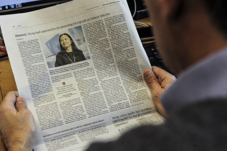 An illustration shows a journalist reading a news page about tech giant Huawei in The Globe and Mail in Montreal, Canada, December 6, 2018. – The arrest of a top executive of Huawei at the request of US authorities signals a toughening stand in Washington on dealing with Chinese tech firms amid longstanding concerns over cyberespionage. Meng Wanzhou (pictured on the news page), Huawei’s chief financial officer, was detained this week in Canada and faces an extradition request from US authorities over an investigation into suspected Iran sanctions violations by the Chinese technology giant. (Photo by Clement SABOURIN / AFP)