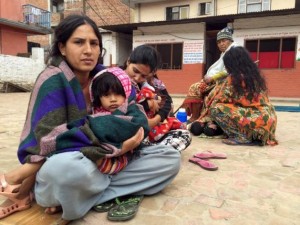 People wait at a school after a 7.7 magnitude earthquake struck, in Kathmandu, Nepal, April 25, 2015.