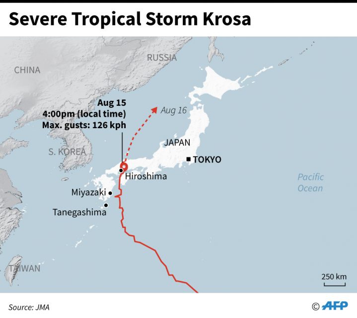 Severe Tropical Storm Krosa — one notch below a typhoon — slammed into the southern Hiroshima region, packing wind gusts of up to 126 kilometers (78 miles) per hour.