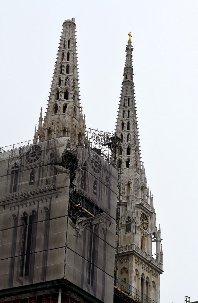 A picture taken on March 22, 2020 shows the dammaged tower of Zagreb’s Cathedral, after an earthquake hit the country at 06:00 am (0500 GMT). – A 5.3-magnitude earthquake shook the Croatian capital of Zagreb on March 22, 2020, damaging buildings and cutting electricity in a number of neighbourhoods. (Photo by Denis LOVROVIC / AFP)
