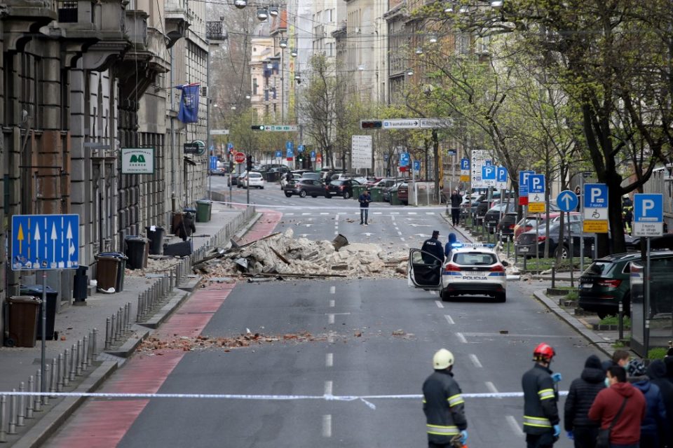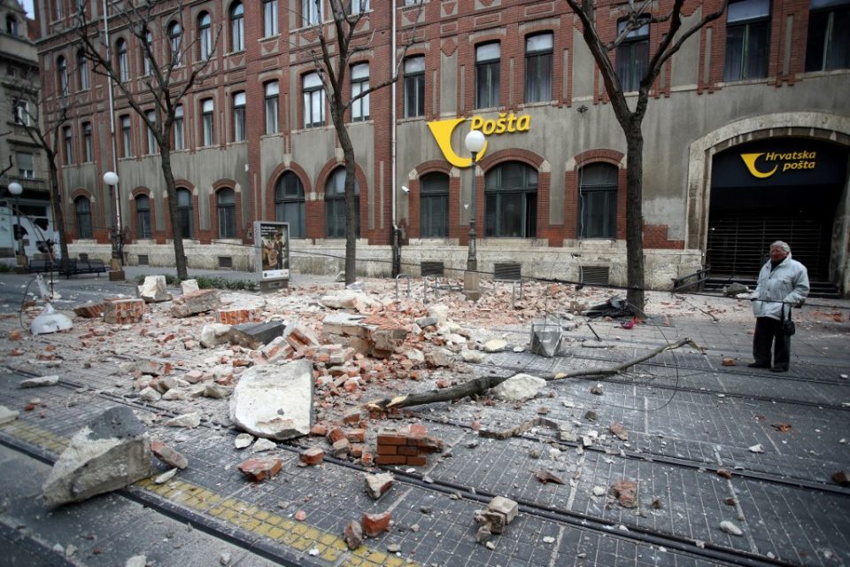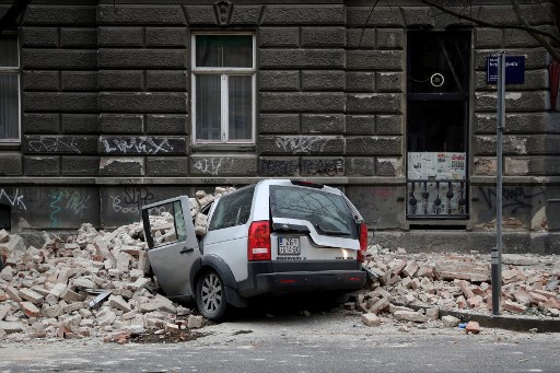 A pedestrian walks past building rubbles laying on the ground, in the streets of downtown Zagreb, on March 22, 2020, after an earthquake hit the country at 06:00 am (0500 GMT). – A 5.3-magnitude earthquake shook the Croatian capital of Zagreb on March 22, 2020, damaging buildings and cutting electricity in a number of neighbourhoods. (Photo by Damir SENCAR / AFP)Croatian policemen and firefighters arrive on the site of a dammaged building, in a street of downtown Zagreb, on March 22, 2020, after and earthquake hit the country at 06:00 am (0500 GMT). – A 5.3-magnitude earthquake shook the Croatian capital of Zagreb on March 22, 2020, damaging buildings and cutting electricity in a number of neighbourhoods. (Photo by Damir SENCAR / AFP)A photograph taken on March 22, 2020 shows a car destroyed by building rubbles in the streets of downtown Zagreb, after an earthquake hit the country at 06:00 am (0500 GMT). – A 5.3-magnitude earthquake shook the Croatian capital of Zagreb on March 22, 2020, damaging buildings and cutting electricity in a number of neighbourhoods. (Photo by Damir SENCAR / AFP)