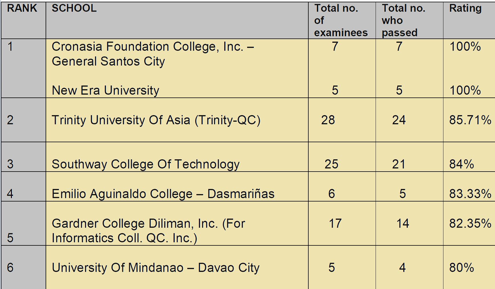Table of top performing schools