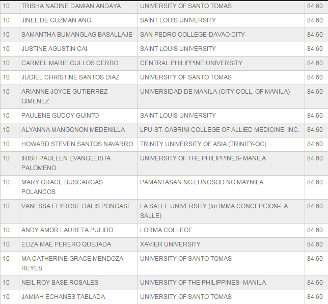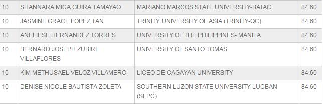 Eric Carolino Jacinto from Saint Louis University and Faith Calzado Rutagines from University of Santo Tomas tied up on the first rank with an average of 86.60%.