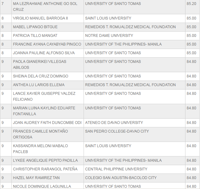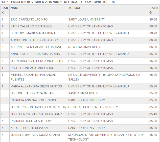Below are the list of the Top 10 Passers and Top Performing Schools for the November 2016 Nurse Licensure Exam: