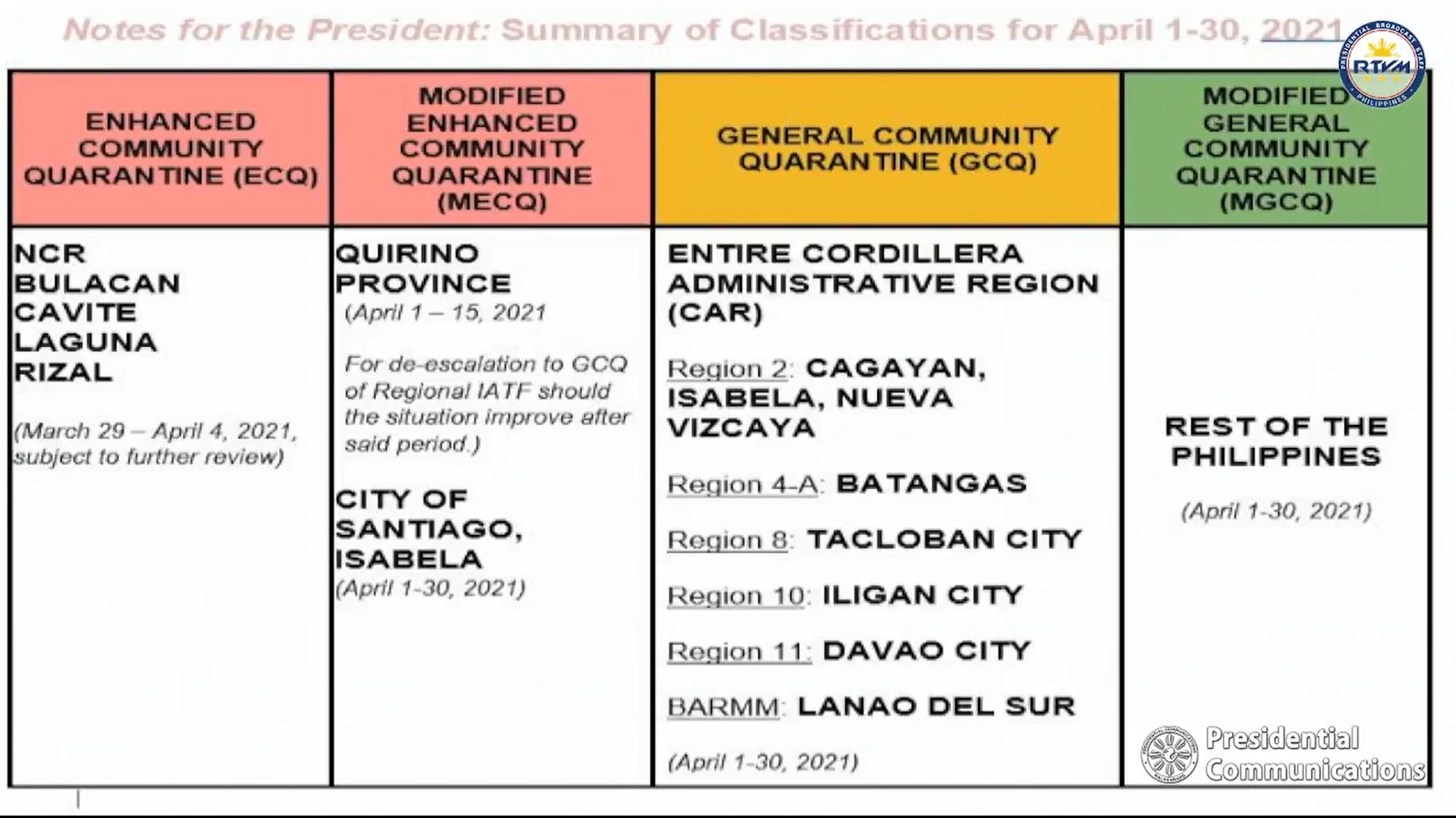 President Duterte also announced these areas to be placed under General Community Quarantine from April 1 to 30: