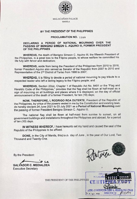 (Eagle News) – President Rodrigo Duterte declared “period of national mourning” for 10 days over the passing of former President Benigno Simeon Aquino III, from June 24, the day of his death until July 3.