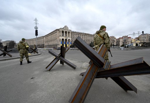 Members of the Ukrainian Territorial Defence Forces, the military reserve of the Ukrainian Armed Forces, stand guard next to anti-tank structures blocking the streets of the center of Kyiv on March 6, 2022. (Photo by Sergei SUPINSKY / AFP)