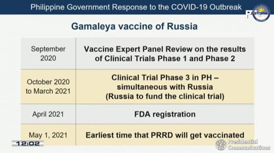 “Mula Oktubre naman po hanggang Marso ng susunod na taon ay magkakaroon ng clinical trial phase 3, simultaneous po iyan sa Russia at sa Pilipinas,” Roque explained.