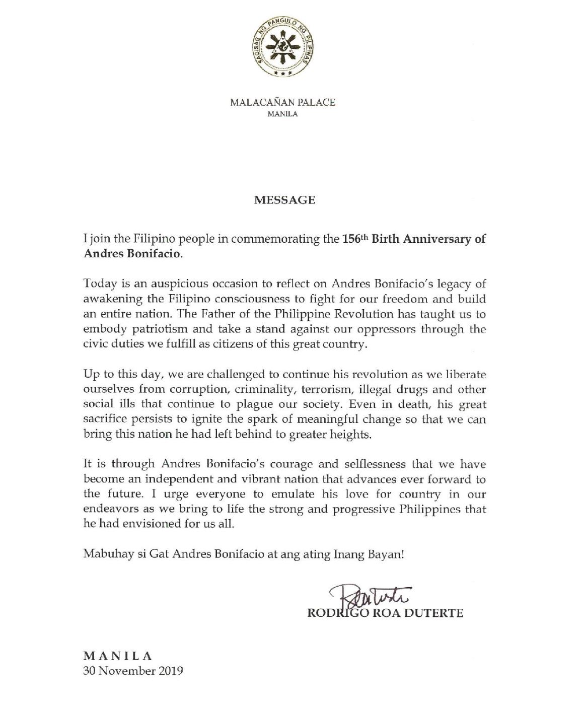 In his Bonifacio Day message, the President said that this day is an “auspicious occasion to reflect” on Bonifacio’s legacy of “awakening the Filipino consciousness to fight for our freedom and build an entire nation.”