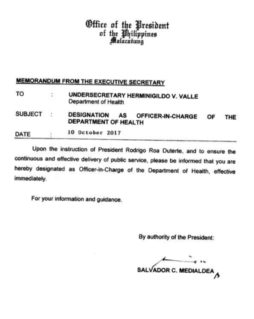 The appointments of Valle and Rio were contained in separate memos issued by Executive Secretary Salvador Medialdea—by authority of the President–and which were released to the media on Oct. 12.