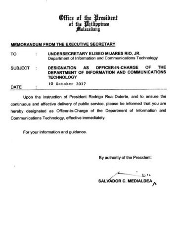 DICT Undersecretary Eliseo Mijares Rio Jr. will take the helm of the agency previously led by Rodolfo Salalima, who resigned in September.
