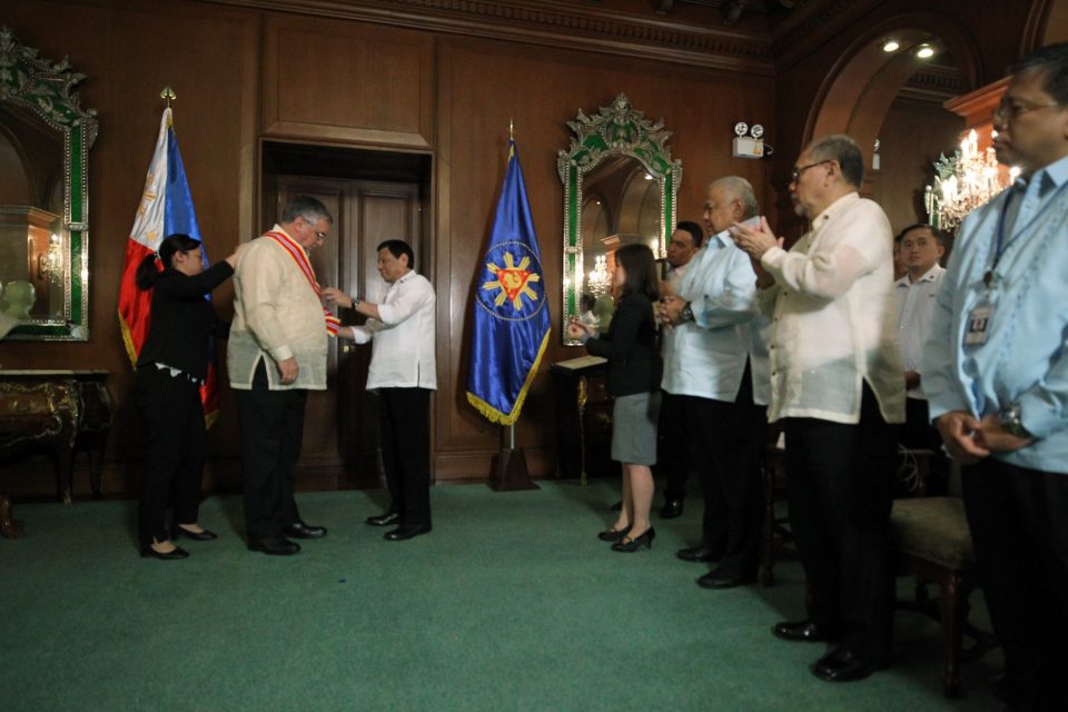 President Rodrigo Duterte has conferred the Order of Sikatuna on outgoing Israel Ambassador to the Philippines Ephraim Ben Matityau during his farewell call at the Music Room of the Malacañan Palace.