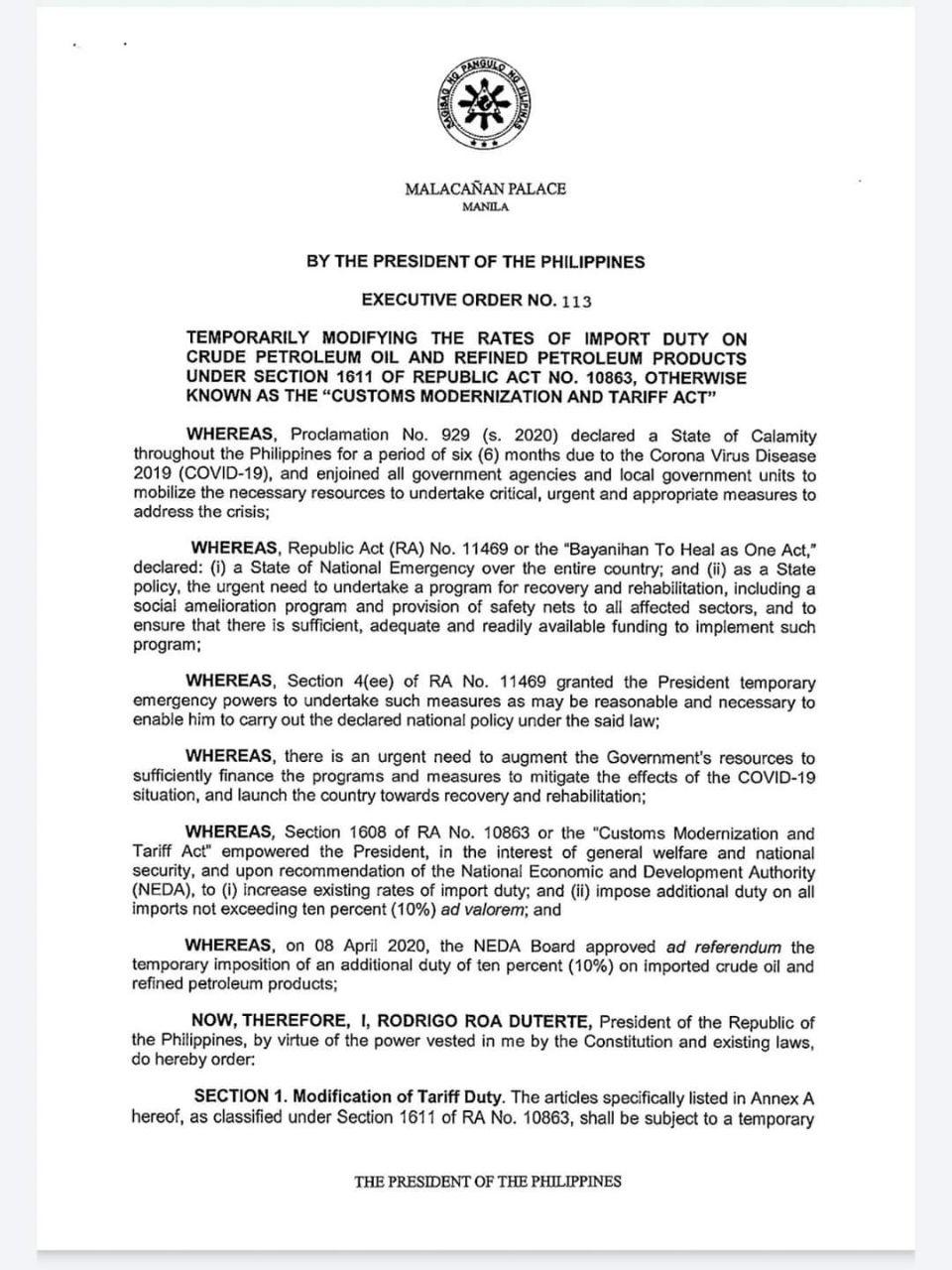 Under Executive Order No. 113, a “temporary additional import duty of ten percent (10%)” will be imposed on imported crude oil and refined petroleum products, on top of existing import duties.