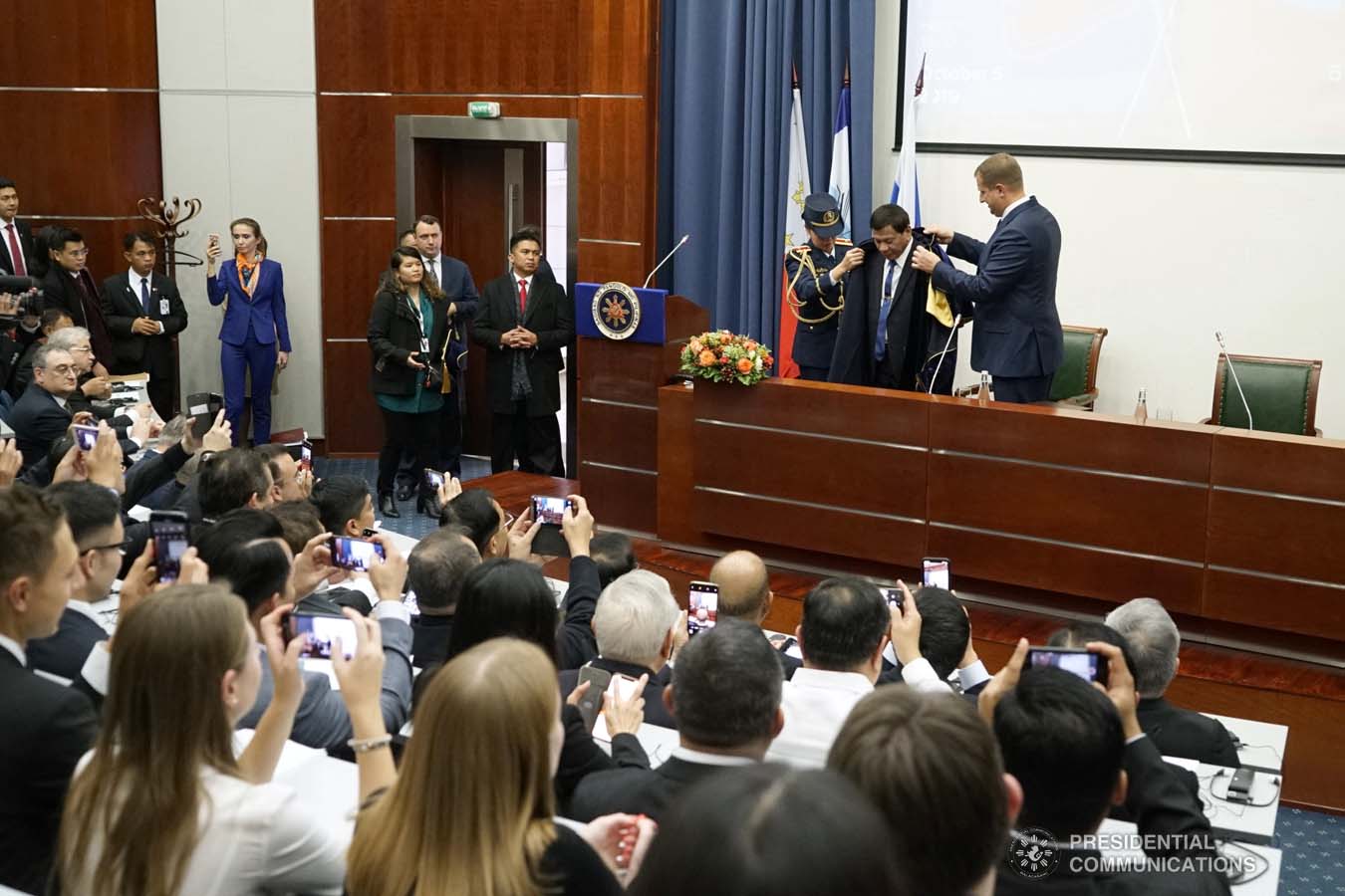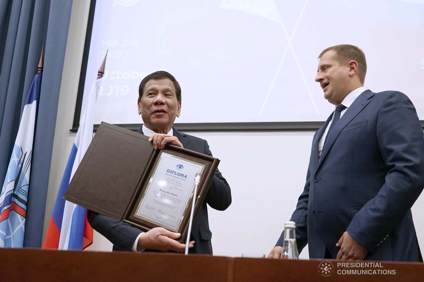 “Russia has a special place in my heart. It’s a great honor for me to speak here today before the future leaders of Russia,” President Duterte said after he was conferred the degree.