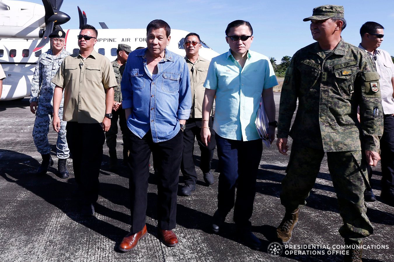 President Rodrigo Roa Duterte is accompanied by Sec. Bong Go of the Office of the Special Assistant to the President and 7th Infantry Division Commander Major General Felimon Santos Jr. upon the President’s arrival at the Casiguran Airport in Aurora before they head to Casiguran Sound on board BRP Davao del Sur for the Philippine Rise Commemoration on May 15, 2018. ALFRED FRIAS/PRESIDENTIAL PHOTO