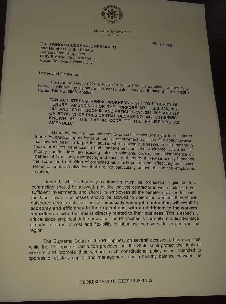 In his veto message, Duterte said that the definition “effectively (proscribes) forms of contractualization that are not particularly unfavorable to the employees involved.”