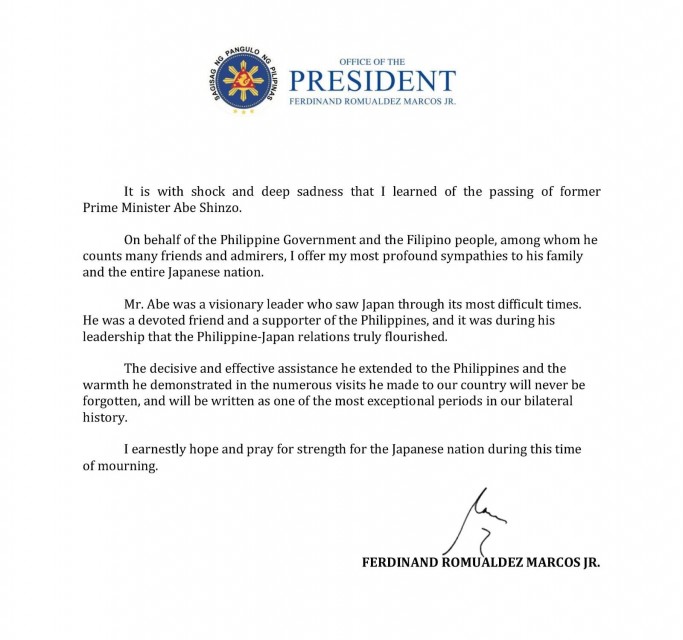 “Mr. Abe was a visionary leader who saw Japan through its most difficult times. He was a devoted friend and a supporter of the Philippines, and it was during his leadership that the Philippine-Japan relations truly flourished,” President Marcos said.