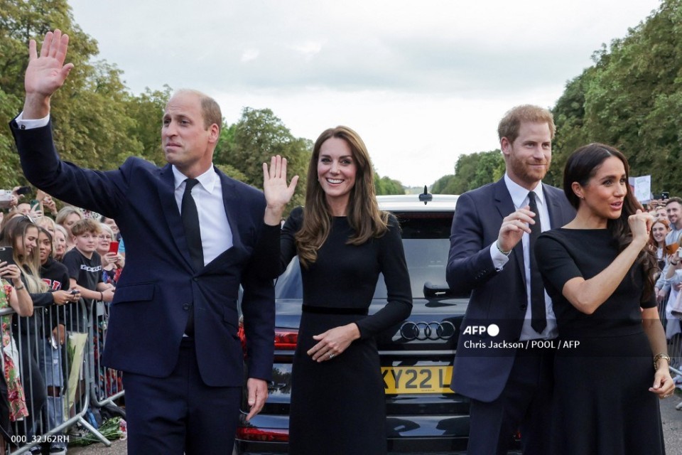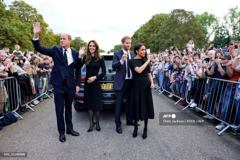 Princes William and Harry and their wives put on a rare united front Saturday to view tributes to Queen Elizabeth II, threatening to upstage their father Charles on the day he was officially proclaimed king.