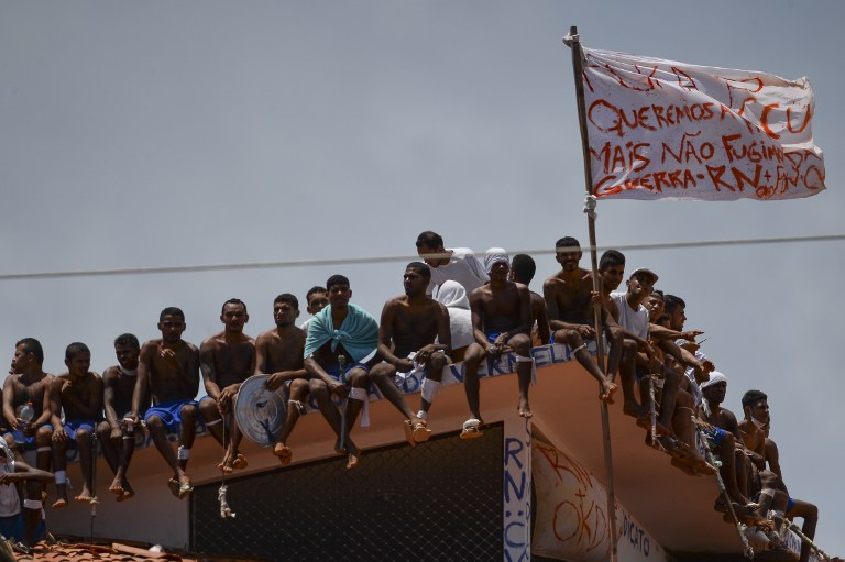 An AFP video reporter filmed the inmates as they stood with flags on the partly destroyed red tile roof of the Alcacuz jail near the northeastern city of Natal.