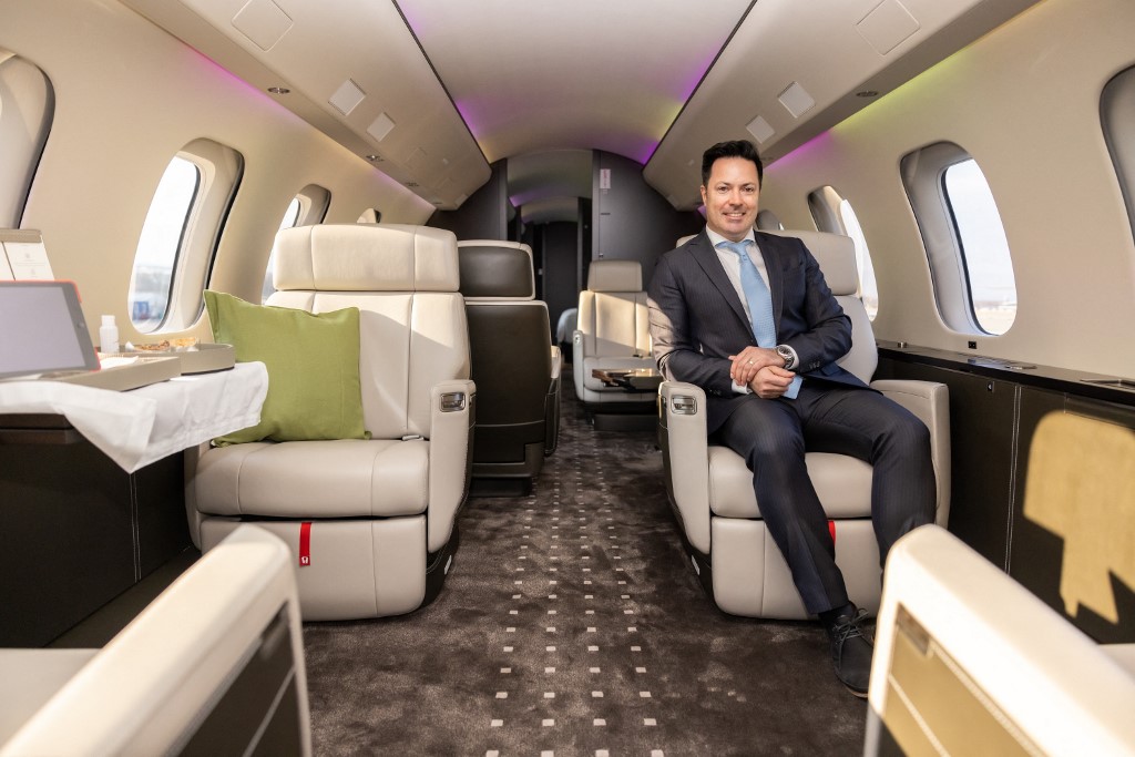 Standing inside the newest addition to the VistaJet fleet, the Global 7500 built by Canadian business jet maker Bombardier, Scalabrini showed off what air travel can look like in that exclusive market.