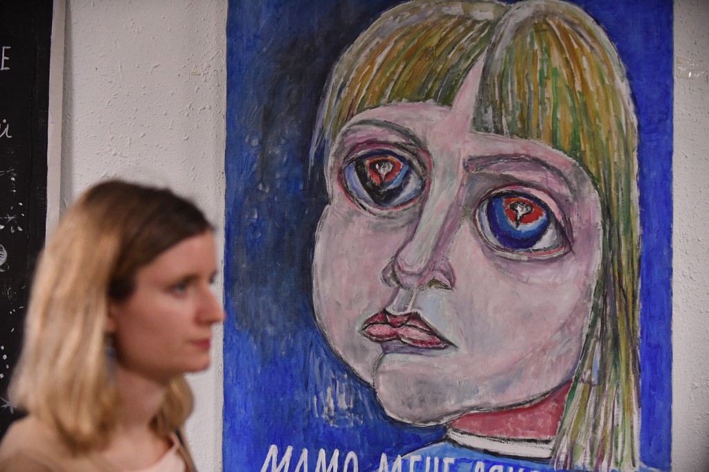 One work shows the face of a little girl with big eyes. “Mom, I am afraid of the war,” read the words next to the image, in Russian and Ukrainian.