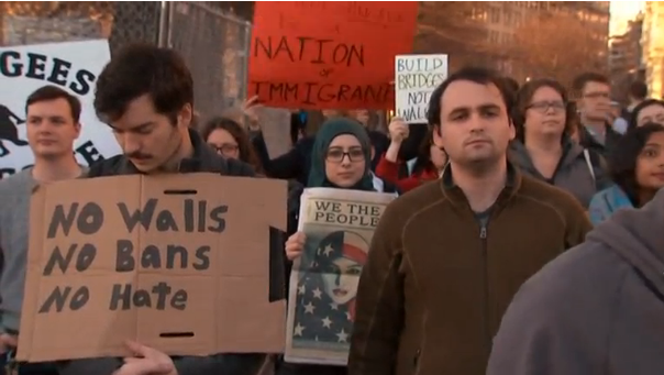 Protesters near the White House chanted “say it loud, say it clear, refugees are welcome here” during rush our to protest the proposed immigration restrictions.