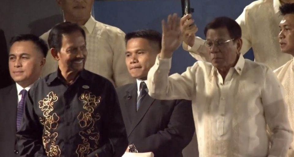 President Rodrigo Duterte proudly waves and cheers during the 2019 SEA Games opening ceremonies at the Philippine Arena as Brunei’s Sultan Hassanal_Bolkiah happily looks on. (Photo courtesy Philippine Information Agency)