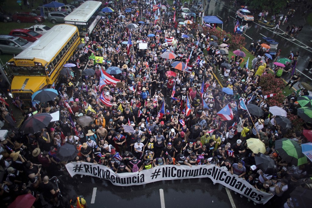 The demonstrators were joined by some of Puerto Rico’s most famous singers, including Ricky Martin. The huge crowds sang, chanted, and danced in the streets while carrying the territory’s red, white and blue flag with a lone star.