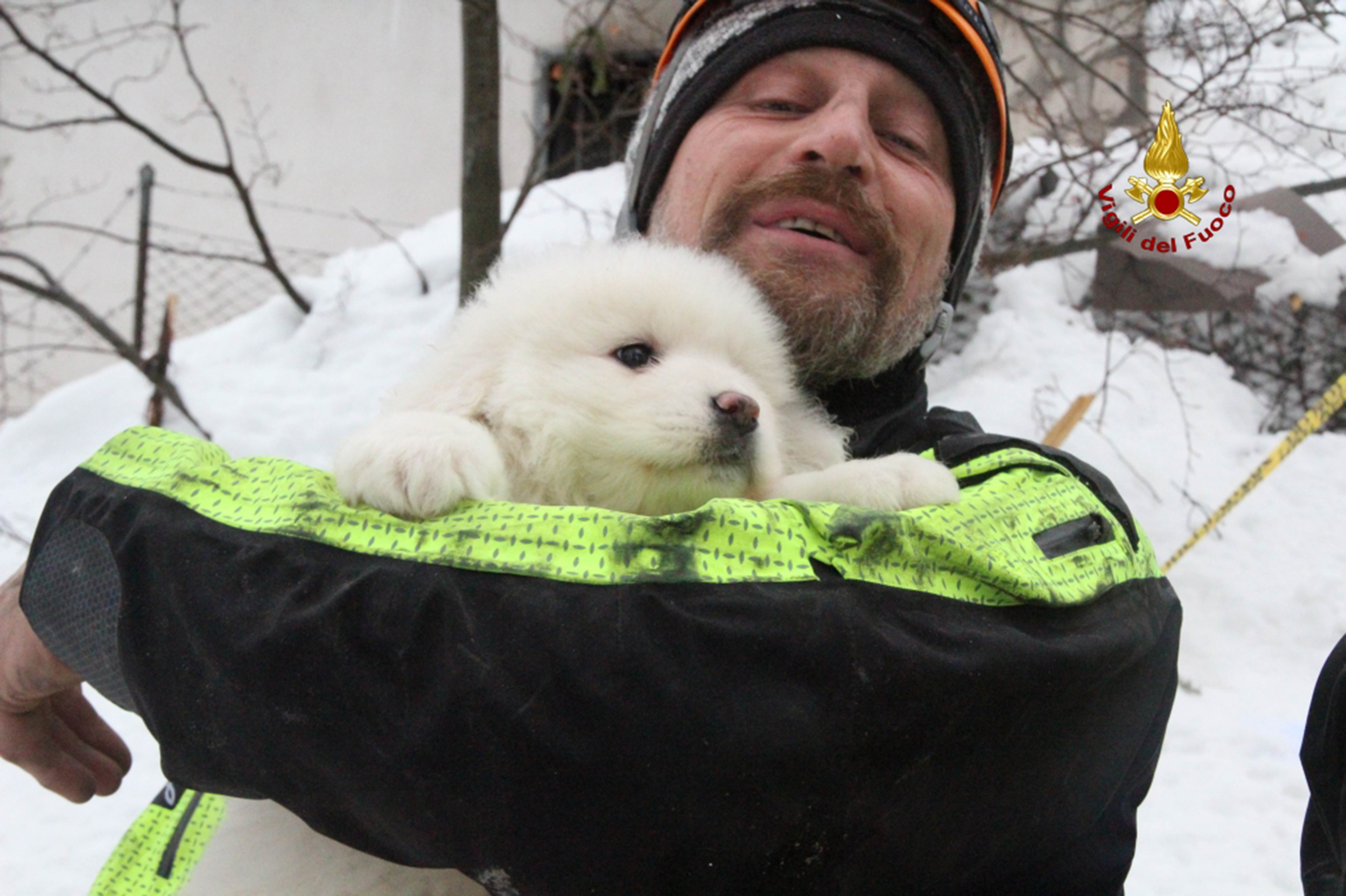 Firefighter Fabio Jerman said the discovery of the three shaggy white Abruzzo sheepdog pups meant there were still air pockets in the collapsed luxury spa resort, “an important sign of life, which gives us hope”.