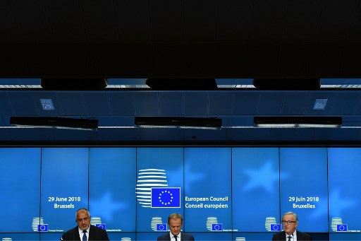 EU leaders clinched a hard-won migration deal during all-night talks on June 29, that Italy’s hardline new premier said meant his country was “no longer alone” in shouldering the responsibility for migrants. / AFP PHOTO / Ben STANSALL