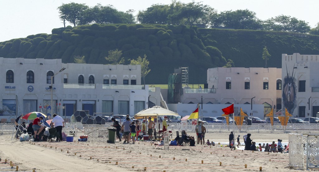 Sun-lovers and jetski enthusiasts braved temperatures of 39 degrees celsius (102 Fahrenheit) at Doha’s Katara Cultural Village, one of the city’s most popular public beaches. (Photo by KARIM JAAFAR / AFP)