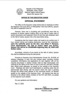 While the Office of the Executive Judge, Cecilyn Burgos-Villavert, denied an employee of the QC Metropolitan Trial Court or the Regional Trial Court died of suspected COVID-19, she said there were “circulating and unconfirmed news that an employee of another agency holding office at the building died of severe pneumonia and COVID-19, and that said employee went to the Hall of Justice, Quezon City a few days before dying.”