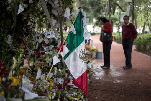 People walk by a memorial of the victims of the recent 7.1-magnitude earthquake in Mexico City on September 27, 2017.