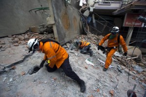 Nepalese military personnel and International rescue check on a collapsed building after earthquake in centre of Kathmandu