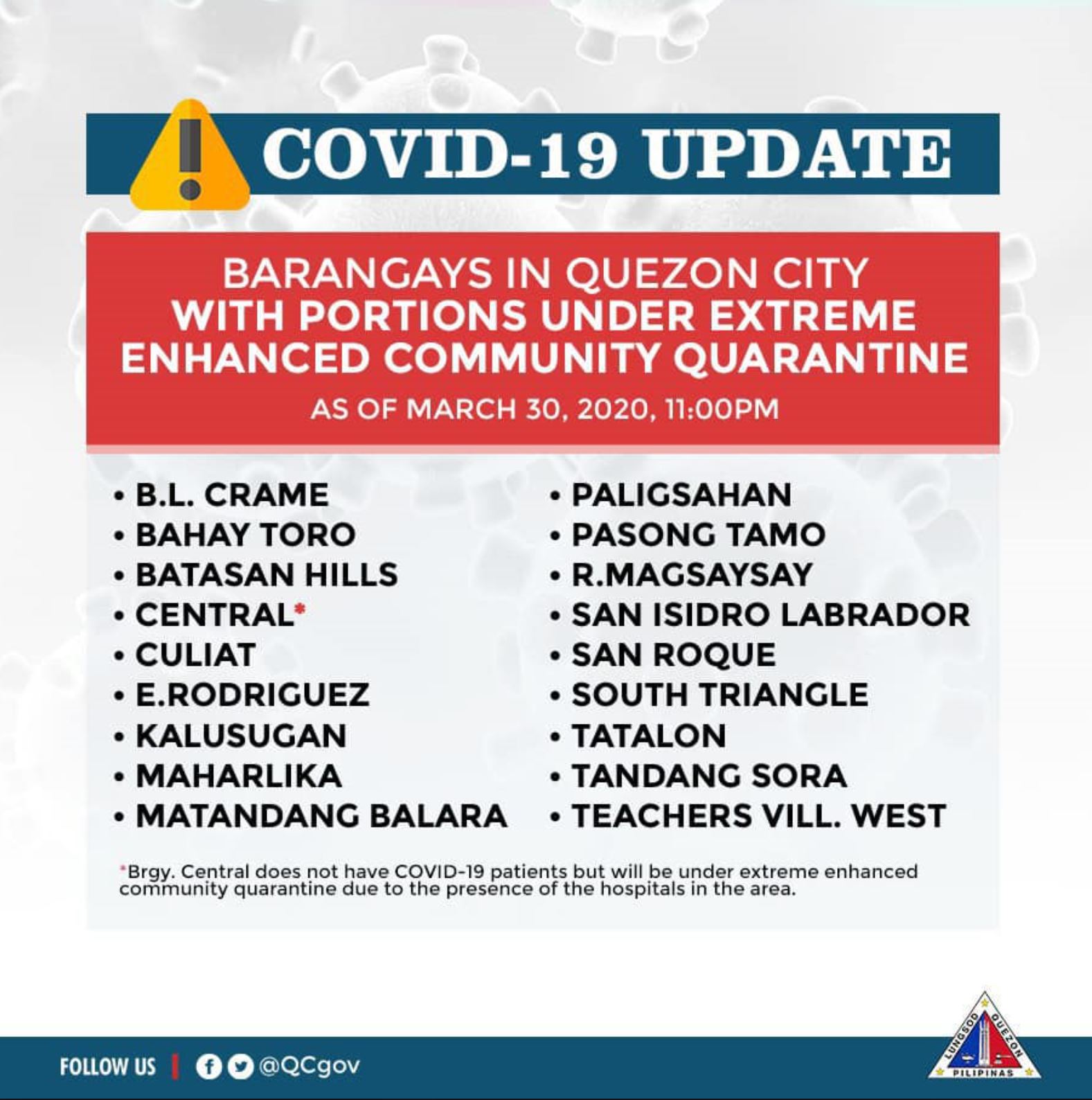 Among these barangays, only barangay Central has no COVID-19 cases but is still placed under extreme enhanced community quarantine “due to the presence of the hospitals in the area,” the Quezon City government’s Facebook page said.