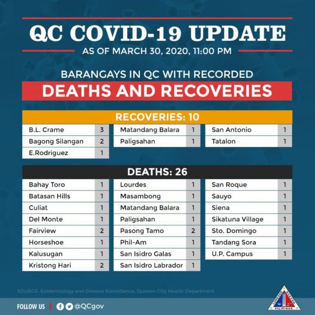 Meanwhile, the barangays with patient recoveries are: B.L. Crame with 3 recoveries, Bagong Silangan with 2 recoveries, and E. Rodriguez, Matandang Balara, Paligsahan, San Antonio, and Tatalon – all with one patient recovery each.