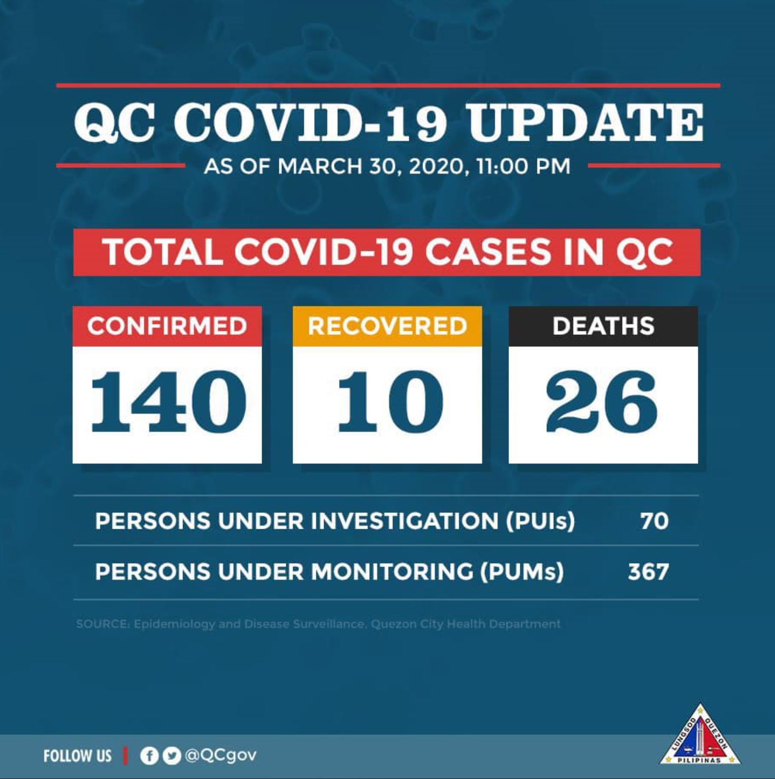 (Eagle News) – Total COVID-19 cases in Quezon City rose to 140, with 26 coronavirus-related deaths, its local government said.