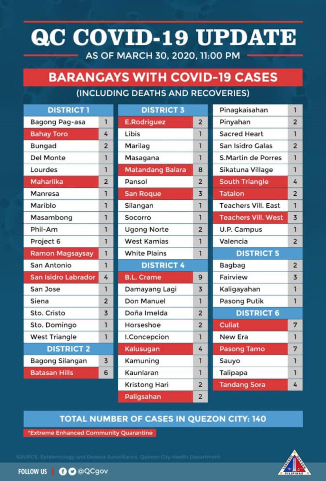 -23 barangays in District 4 with six of them under extreme enhanced community quarantine (EECQ) namely barangays B.L. Crame with nine cases, Kalusugan with four cases, Paligsahan with two cases, South Triangle with four cases, Teachers’ Village West with three cases, and Tatalon with two cases.